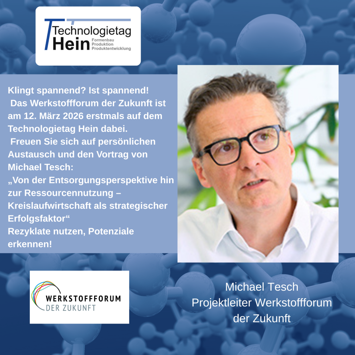 Das Werkstoffforum der Zukunft feiert seine Premiere als Aussteller auf dem Technologietag Hein am 12.03.2026. Mit dabei ist Michael Tesch vom Werkstoffforum der Zukunft, der in einem informativen Vortrag spannende Einblicke zum Thema
